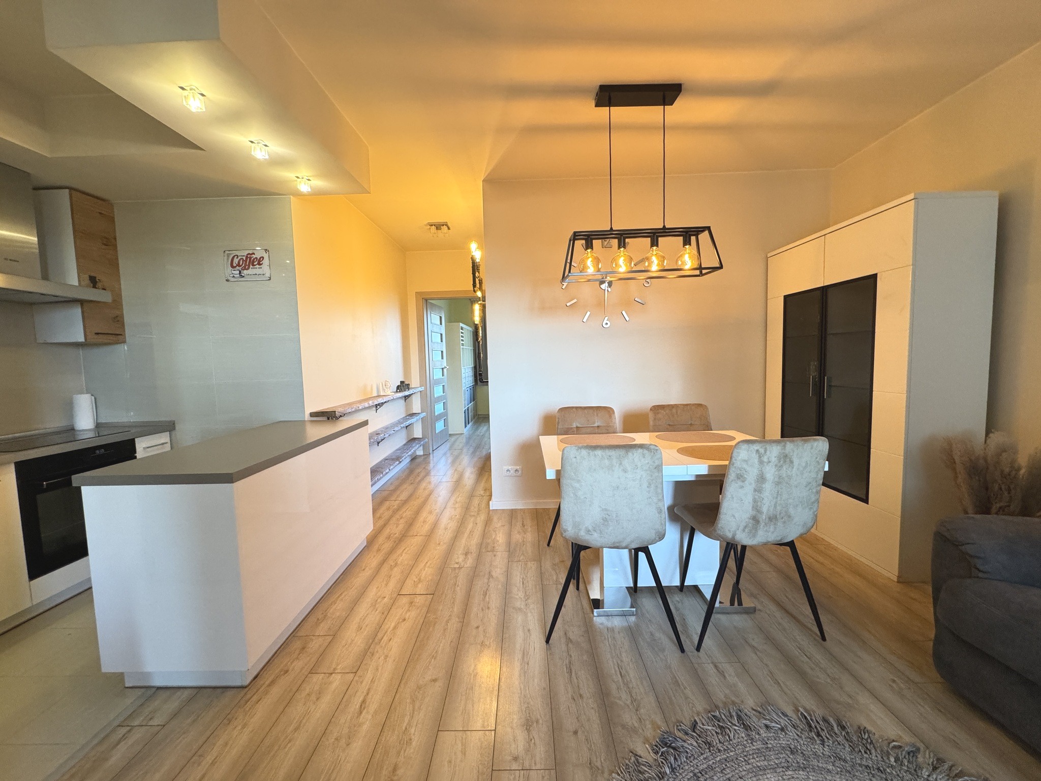 - Salon z aneksem kuchennym: Nowoczesna zabudowa, funkcjonalna wyspa i przestrzeń sprzyjająca relaksowi.