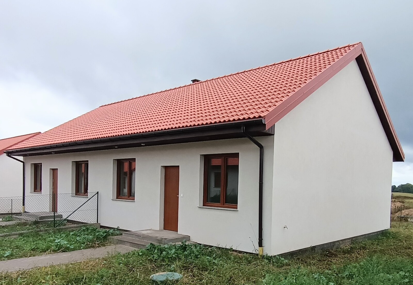 Dach pokryty betonową dachówką wykończony podbitką z oświetleniem , dom ocieplony styropianem 15 cm .Okna wyposażone w rolety antywłamaniowe, w lokalu rozprowadzone jest ogrzewanie podłogowe oraz zamontowana pompa ciepła .
